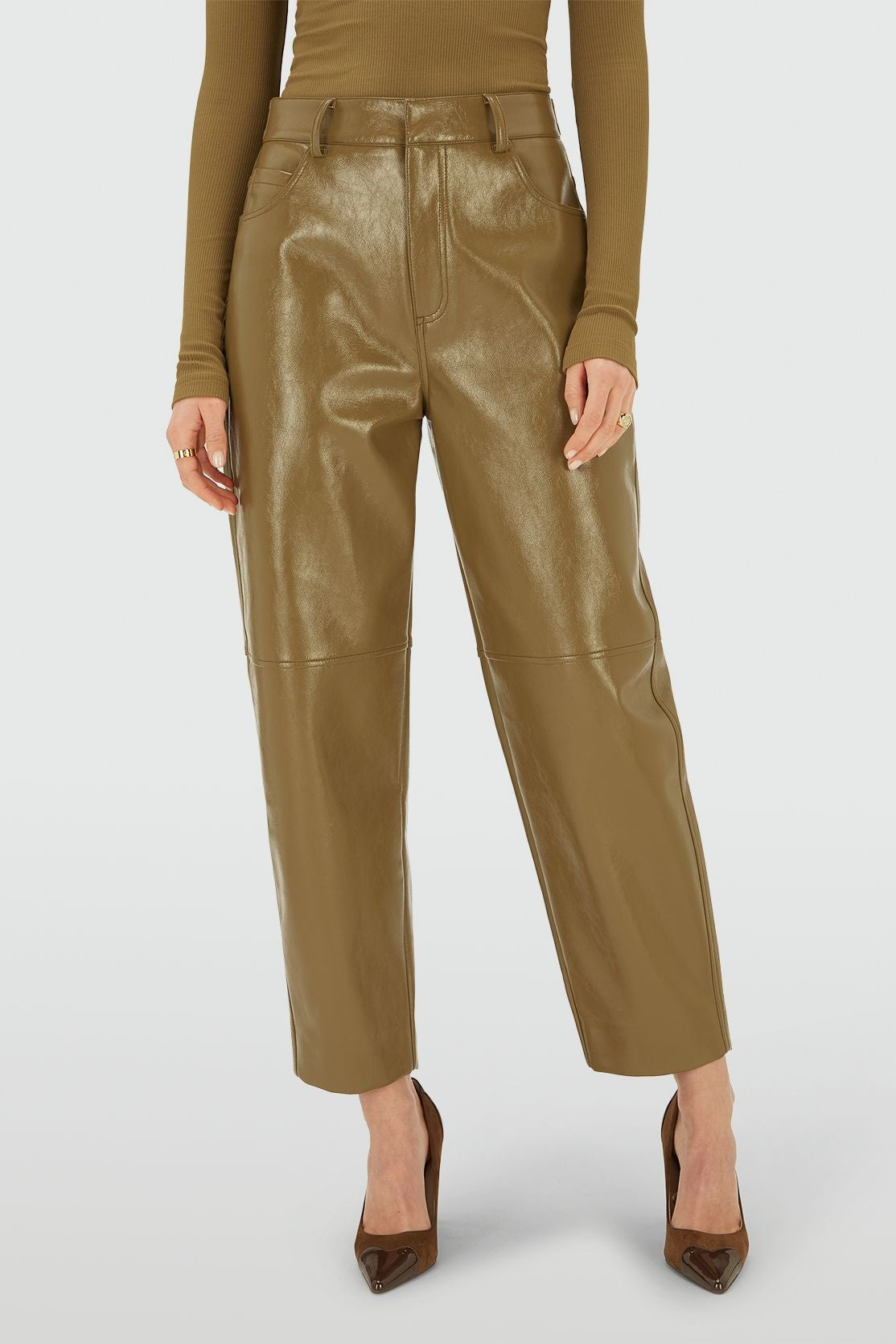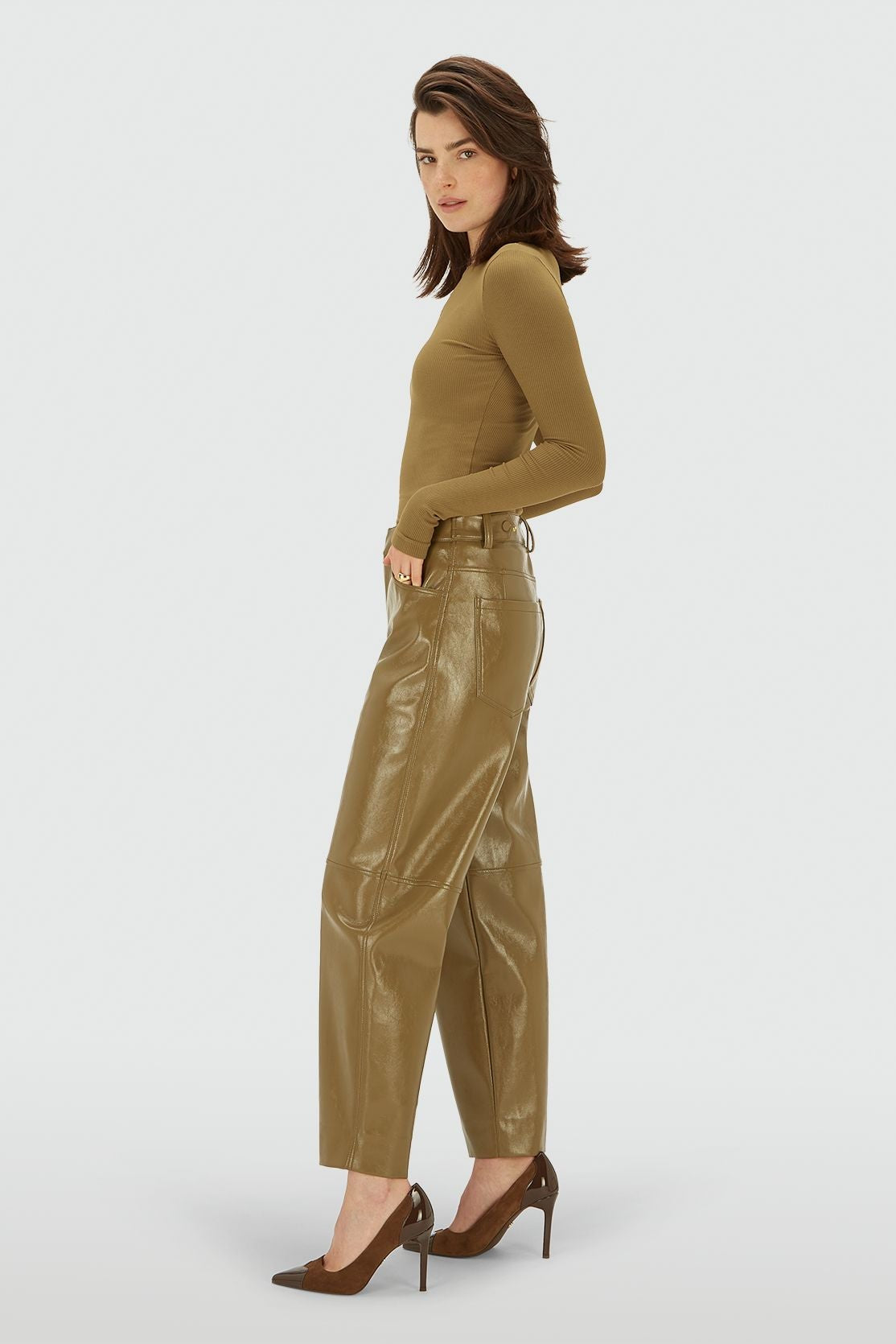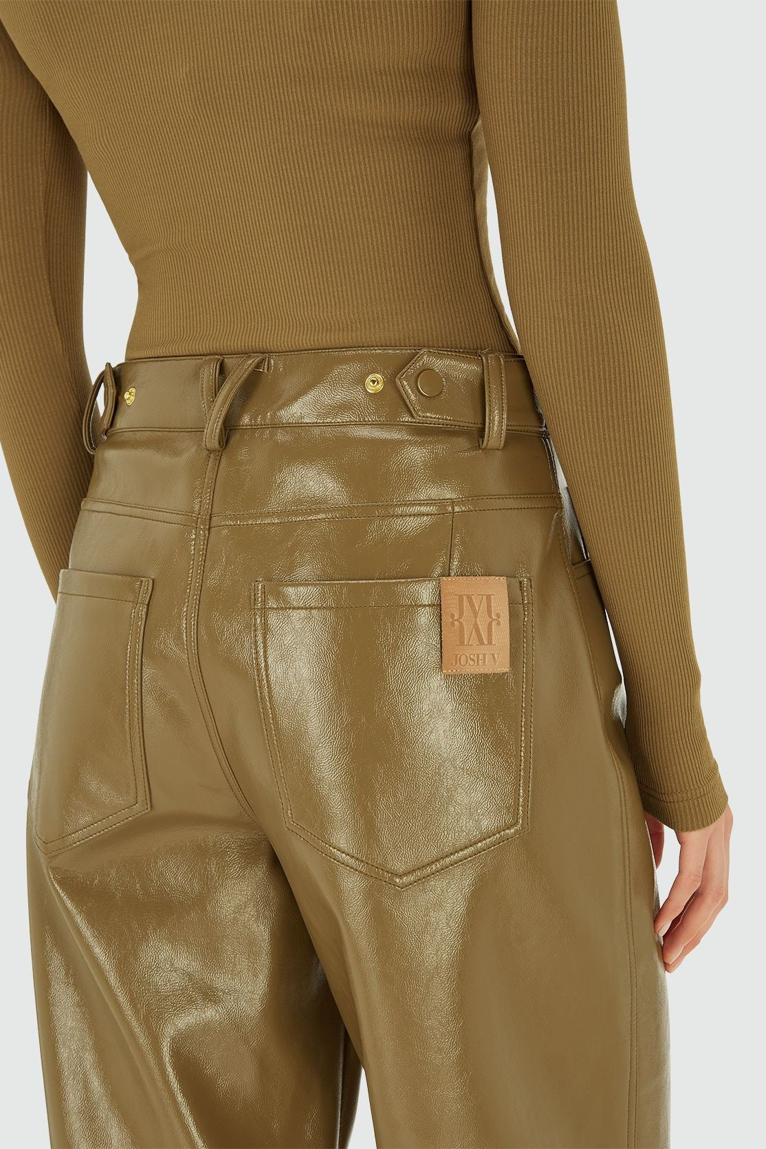 As calças JOSH V Rae na cor verde-oliva são feitas de couro sintético envernizado com elastano e apresentam um corte reto e modelagem regular. Estas calças de cintura média também podem ser usadas com cintura alta graças ao cós ajustável com botões de pressão. Para o comprimento ideal, você pode ajustar a altura das calças em nossas lojas. O discreto logotipo em couro na parte de trás completa o design. Use as calças de corte reto com uma blusa branca oversized e tênis para um look moderno e ousado, ou combine com salto alto e um blazer para um toque de elegância.