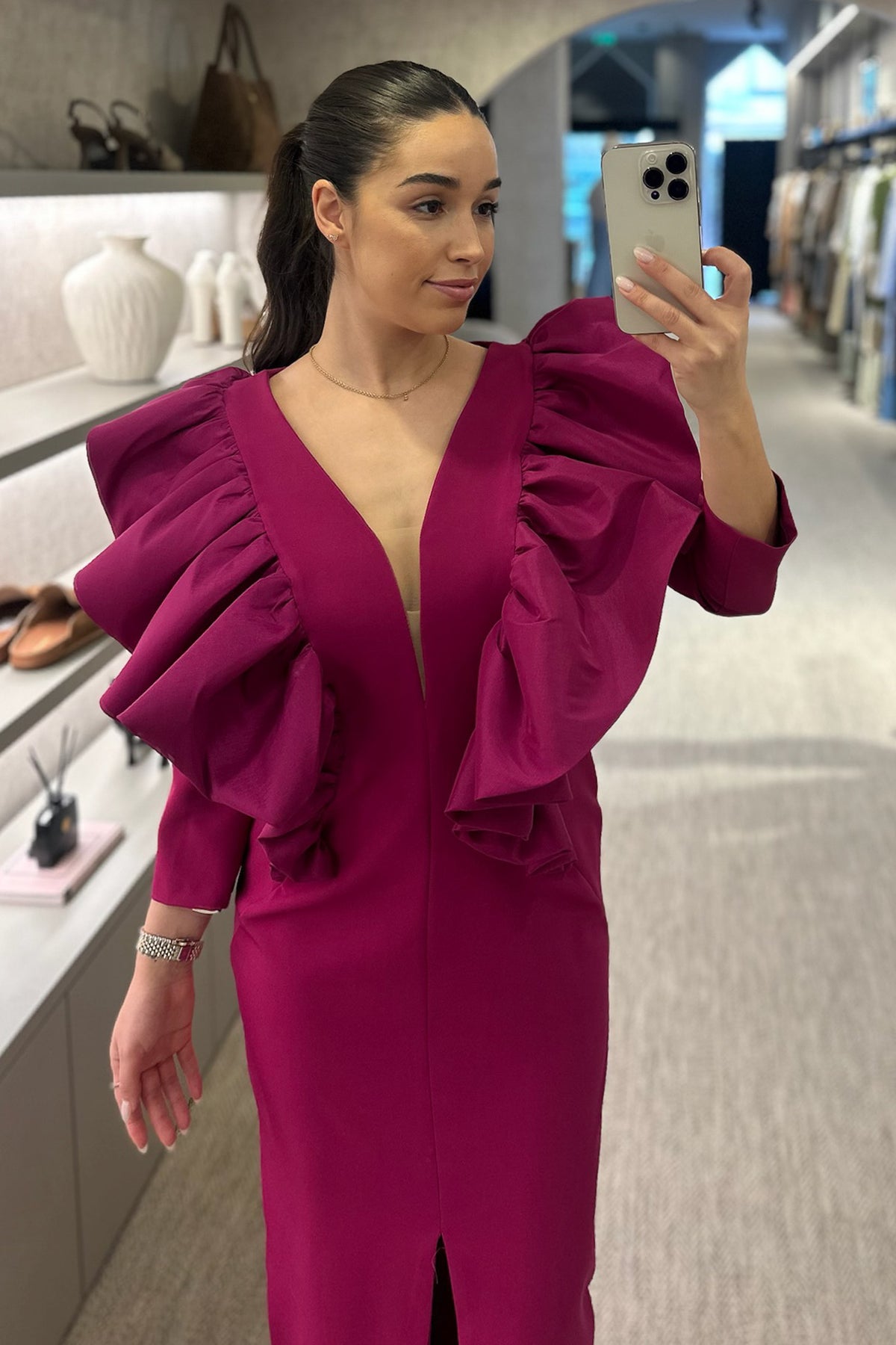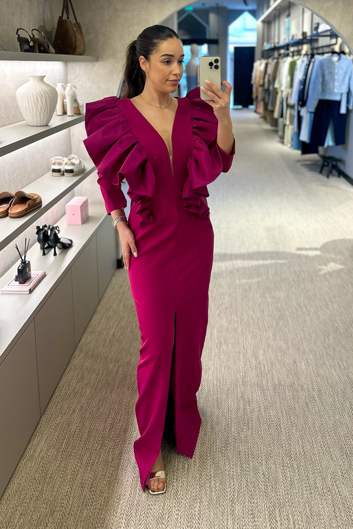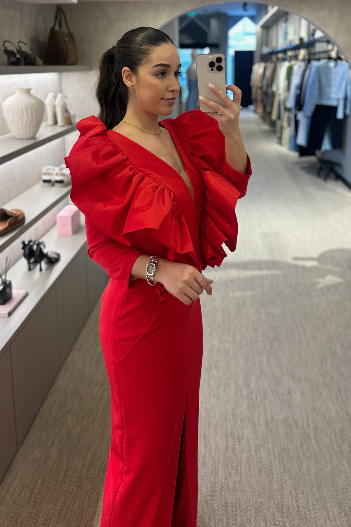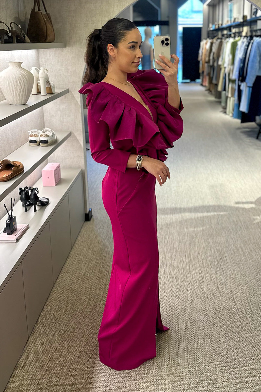 Vestido cerimónia disponível em vermelho e em pitaya