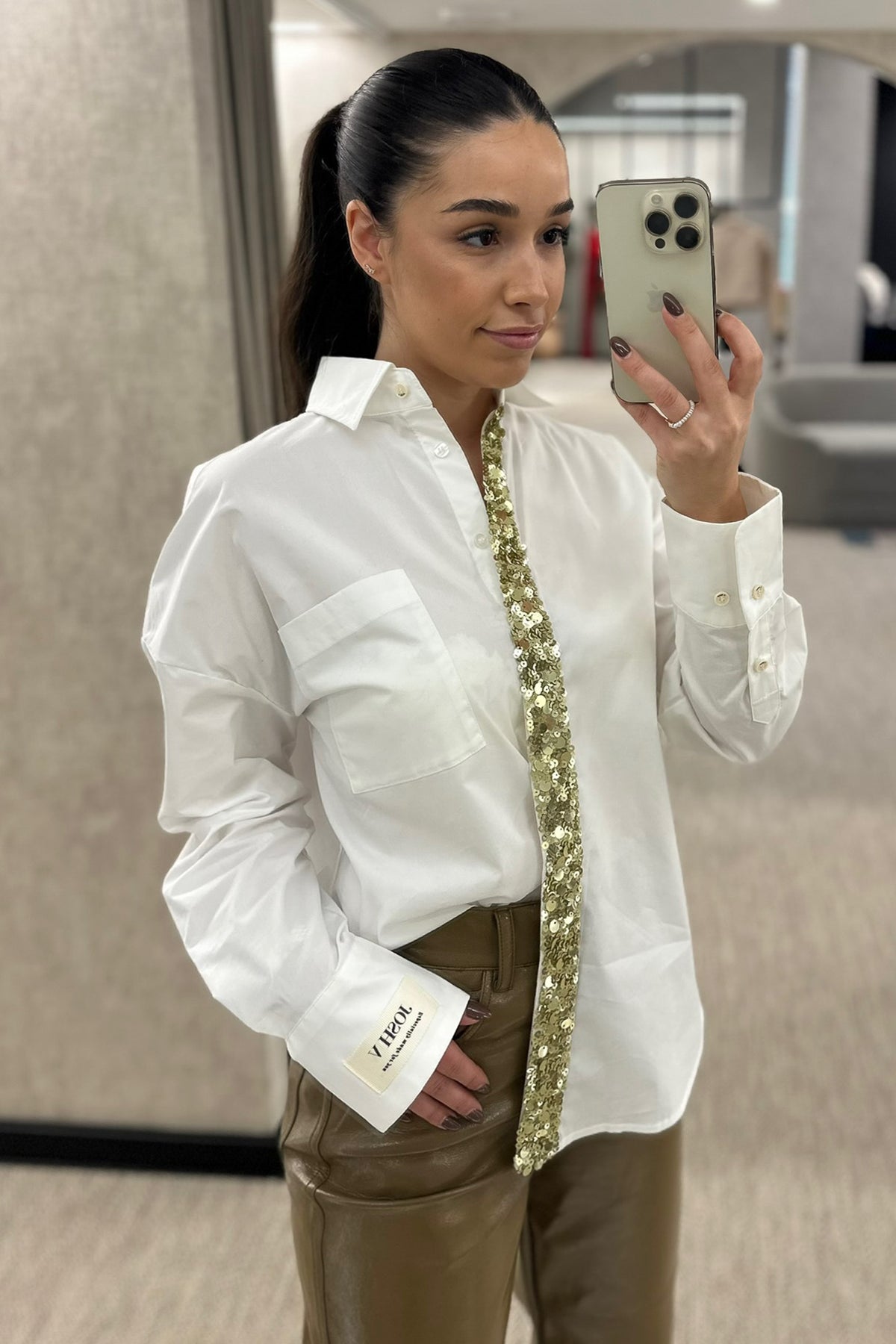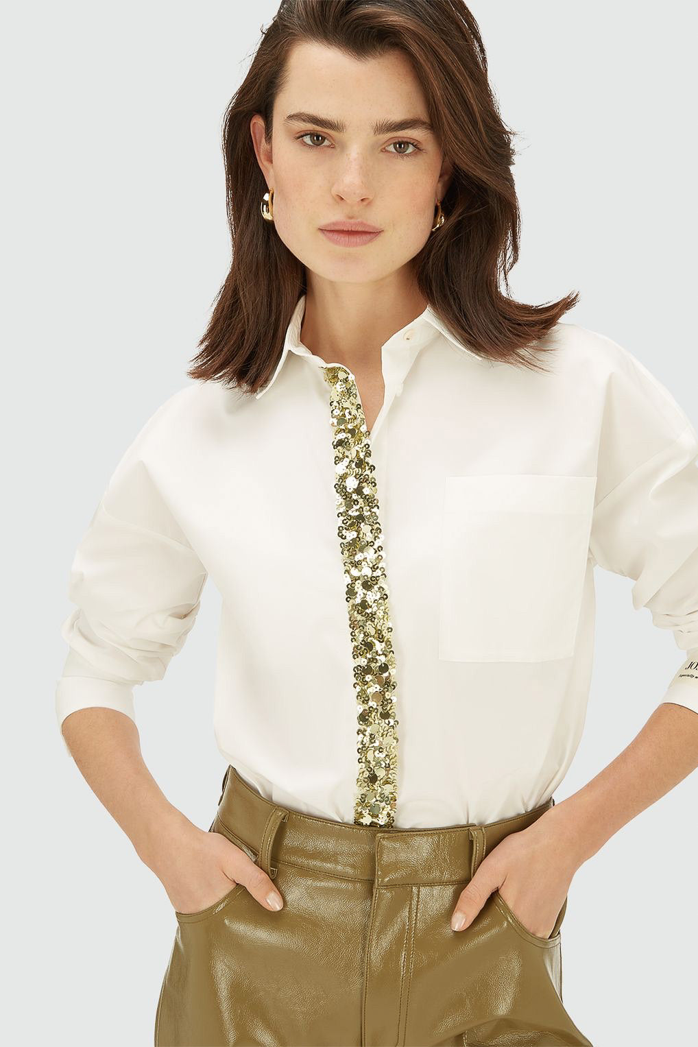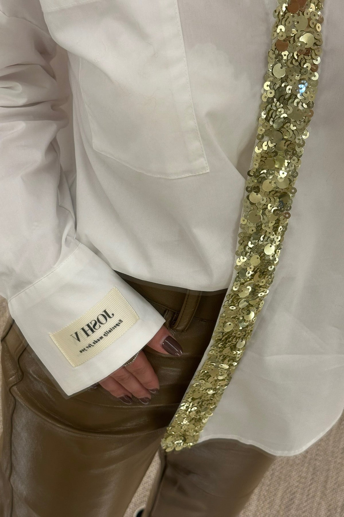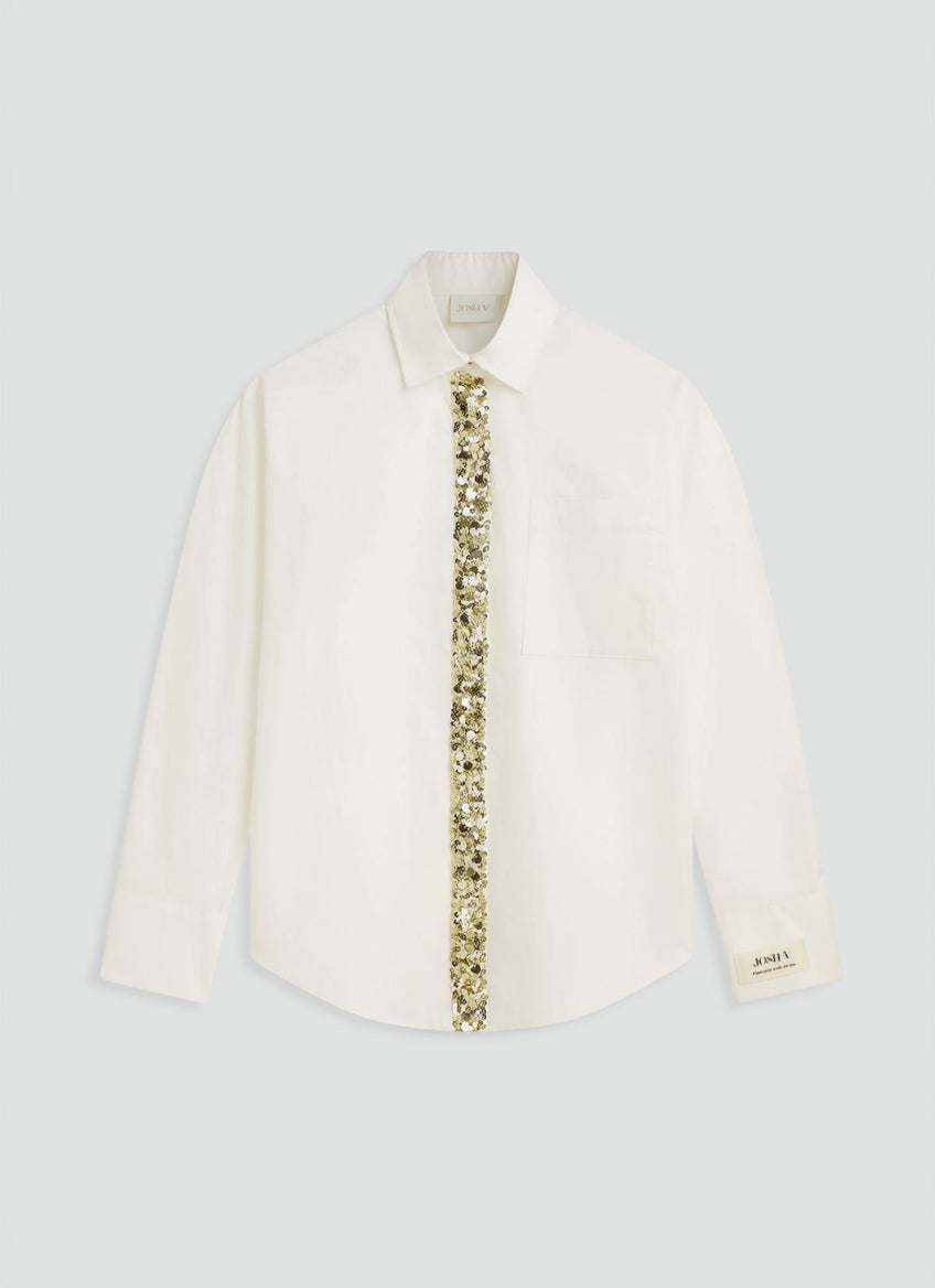A blusa feminina Cecile da JOSH V na cor Off White combina conforto com um visual luxuoso. Esta blusa oversized é confeccionada em popeline stretch com poliéster e algodão reciclados, provenientes da Better Cotton Initiative (BCI™). O bolso no peito e o emblema JOSH V na manga esquerda adicionam detalhes refinados, enquanto as lantejoulas douradas na carcela dos botões conferem um toque elegante. Combine a blusa com calças de alfaiataria e salto alto para um look chique, ou use-a com jeans e botas de cano curto para uma produção casual.