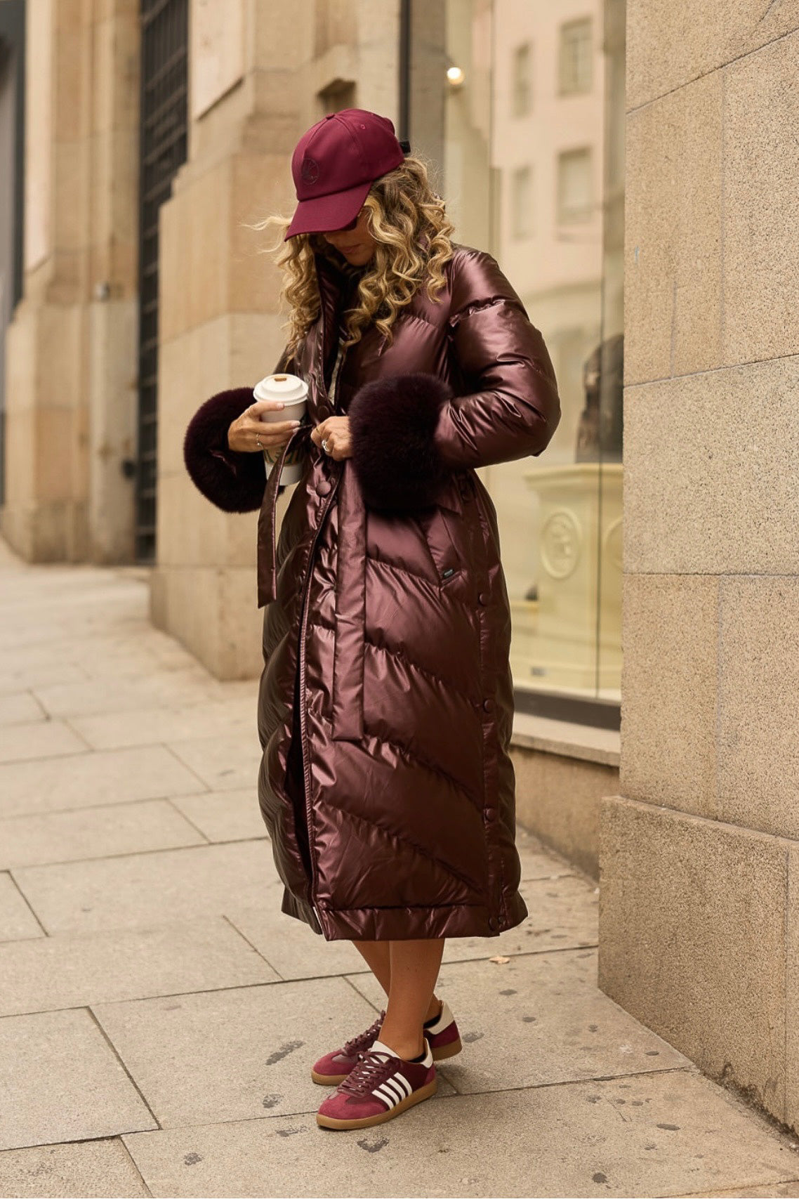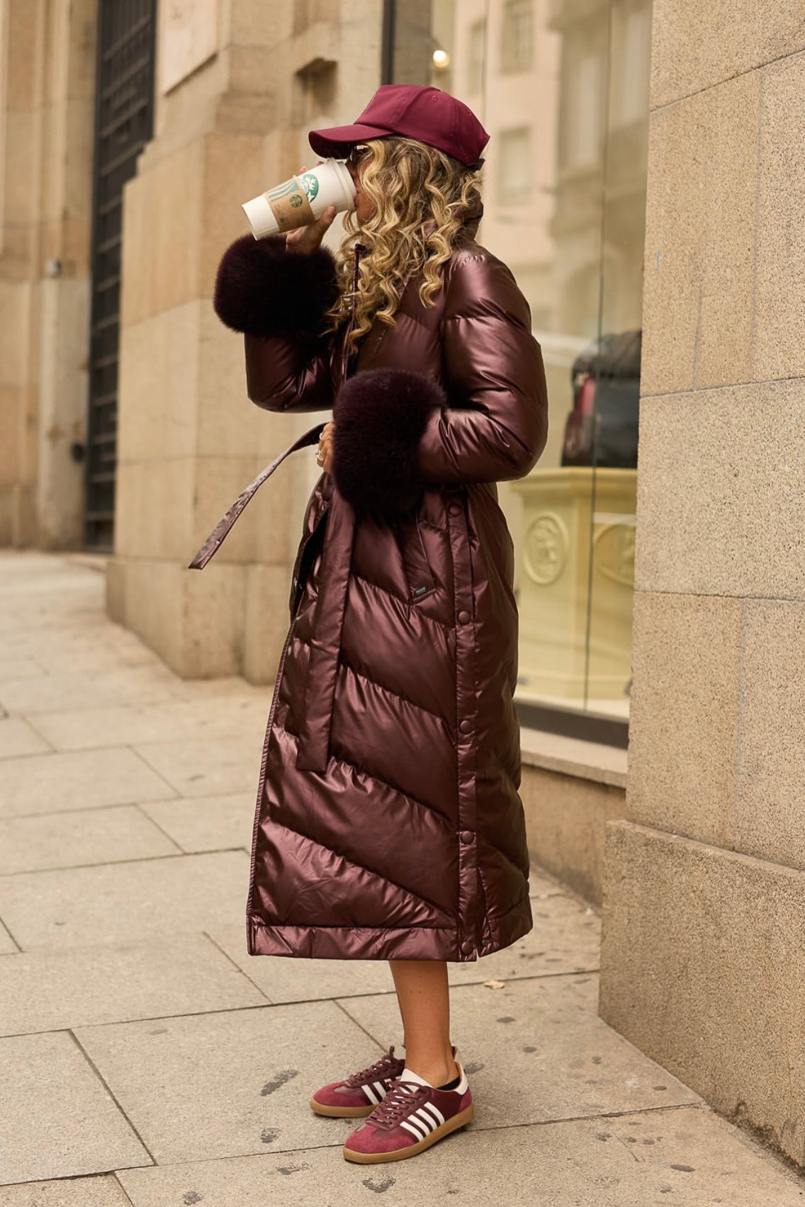 Casaco longo - 100% Microfibra com gola e punhos raposa em cor burgundy