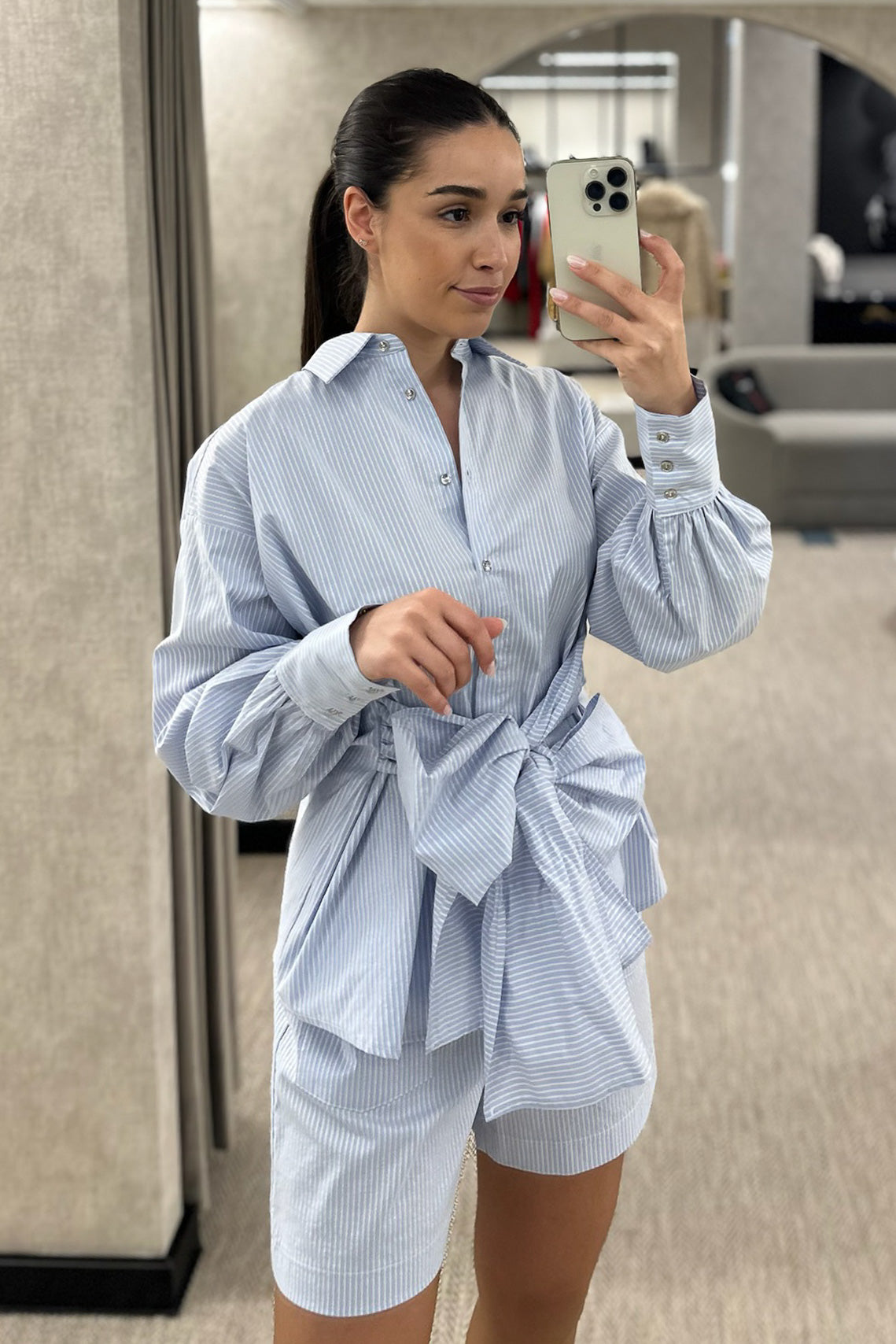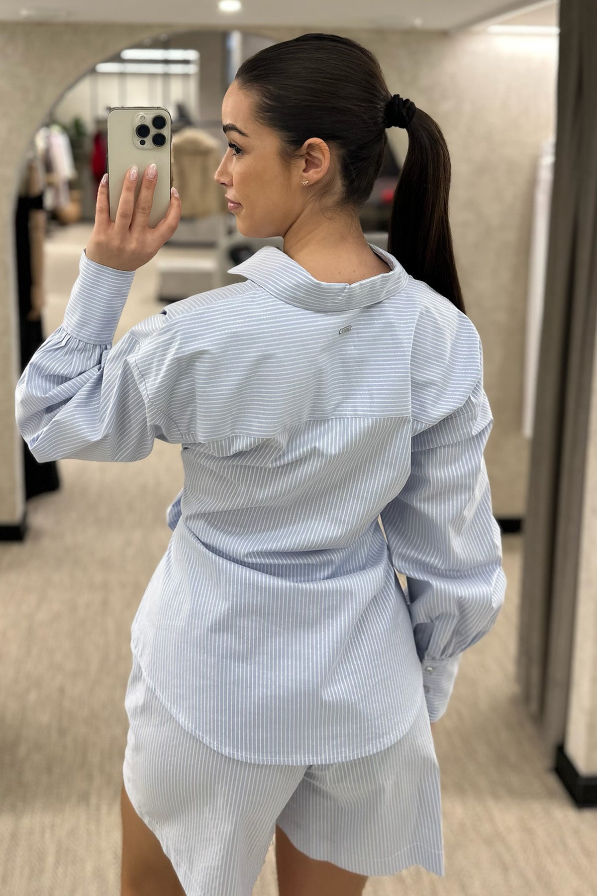 Camisa azul às riscas brancas